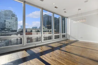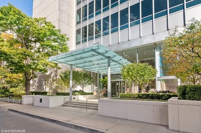 Exceptional South facing unit awaits you at The Montgomery. This 2 Bedroom - 2 Bathroom offers an enclosed office for added versatility. Revel in the expansive city vistas flooding through the floor-to-ceiling windows, complemented by high ceilings and gleaming hardwood floors. The living room and primary bedroom come equipped with high-end surround sound for an immersive experience. The intelligent layout features split bedrooms, providing both privacy and an abundance of adaptable living and dining space. The open galley kitchen is a culinary haven, showcasing a spacious breakfast bar, granite counters, premium crisp white Italian cabinetry and stainless steel appliances. Step into the primary suite, where a generous 12X13X4.5 organized walk-in closet, additional linen closet, and a well-appointed bathroom with dual vanities, separate tub, and shower await. The second bedroom offers a wall of closets with custom built-ins. Convenience is elevated with in-unit washer and dryer. Included in the assessment are heating, air conditioning, gas, cable, and internet, ensuring a hassle-free living experience. The Montgomery stands as a full-amenity building with a 24-hour door staff, on-site management, an in-house engineer, fully equipped gym, and a roof deck boasting panoramic city views. Immerse yourself in the professionally landscaped grounds featuring fire pits, grill stations, a private dog run, in-unit package delivery service, and a dry cleaner. Nestled on one of River North's picturesque tree-lined streets, this residence is conveniently located near the Chicago River, Montgomery Ward Park, East Bank Club, Starbucks, and the vibrant shopping and nightlife of the neighborhood. Don't overlook the option to acquire a heated garage parking space for an additional $35k.