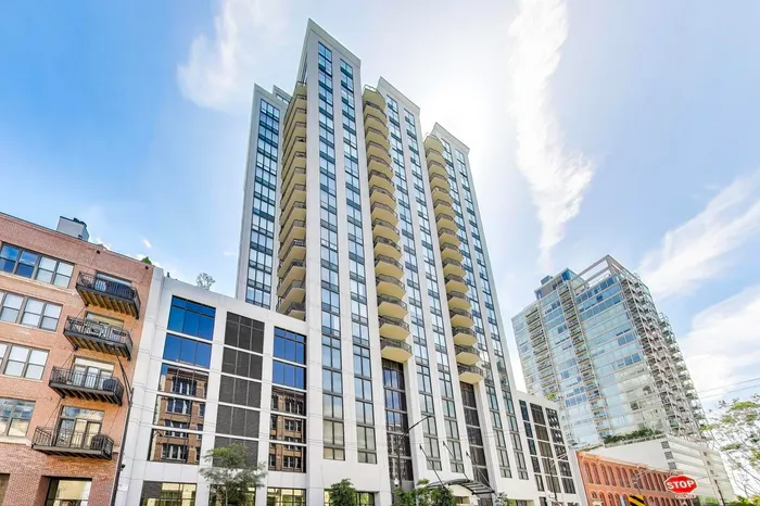 Breathtaking skyline views await in this sun-drenched 2 bed, 2 bath corner unit in the heart of River North. Expansive windows and high ceilings fill the open-concept living space with natural light, creating an airy and inviting atmosphere. The spacious kitchen, living, and dining areas flow seamlessly-perfect for both relaxing and entertaining. Updated, spa like bathrooms and washer dryer in unit. Step out onto your private balcony with south and west exposures, ideal for grilling and soaking in the sunset views. Located in a well-maintained, full-amenity building featuring a rooftop deck, fitness center, 24-hour doorman, and additional storage. Unbeatable location just steps to the CTA, parks, coffee shops, restaurants, and shopping. Garage parking $35,000 additional.