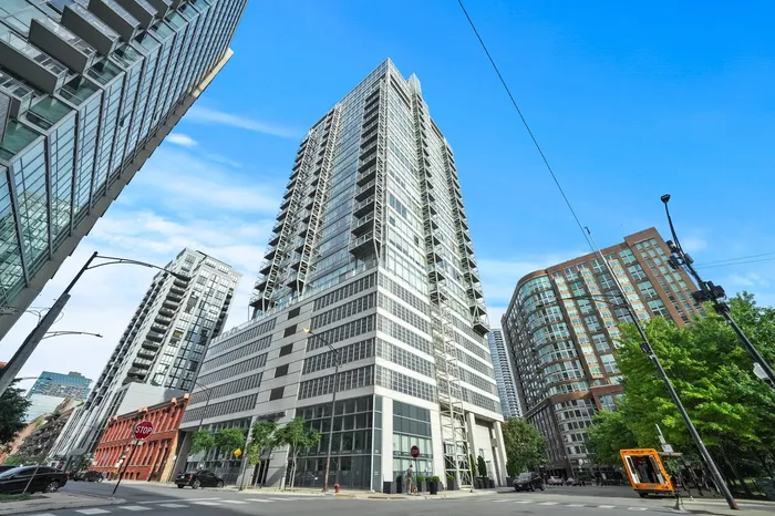 Stunning 1 Bedroom + Den in the Heart of River North! This rarely available "08" tier condo boasts floor-to-ceiling windows, hardwood floors, and a private balcony. The oversized kitchen features granite countertops, light gray/white cabinetry, stainless steel appliances, and a large island overlooking the open-concept living and dining area. The spacious den is ideal for a home office or flexible space to suit your needs. The bedroom comfortably fits a king-size bed and includes a walk-in closet. Upgrades include fresh paint, a fridge replaced in 2020, a dishwasher replaced in 2025, wood flooring updated in 2025, and a bathroom remodeled in 2019. Heated garage parking ($35K) and additional storage are included. Building amenities feature a 24/7 doorman, fitness center, and two nearby dog parks. Located just steps from the Loop, Starbucks, Erie Park, cafes, fine dining, CTA, and more! Take a 3D Tour - click the 3D button to explore every detail of this beautiful home.