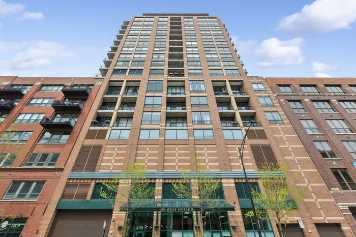 One of the largest floor plans at Gallery 400, this extra wide, two bedroom/ two bathroom residence offers stylish, modern, open concept living. Enjoy 11-foot ceilings, hardwood floors, and abundant natural light from south facing oversized windows. The spacious layout includes a private balcony and a contemporary kitchen with stainless steel appliances, granite countertops, breakfast bar, and separate dining area. Both bedrooms are fully enclosed for privacy, including a generous primary suite featuring a massive California walk-in closet and a luxurious en-suite bath with granite counters, dual vanity, soaking tub, and separate shower. Additional highlights include in-unit laundry, ample storage and an available deeded parking space. This home is located in a full service building with 24-hour door staff, fitness center, and on-site management. Steps to top tier dining, shopping, nightlife, the East Bank Club, Montgomery Ward Park, and easy access to public transit and highways.
